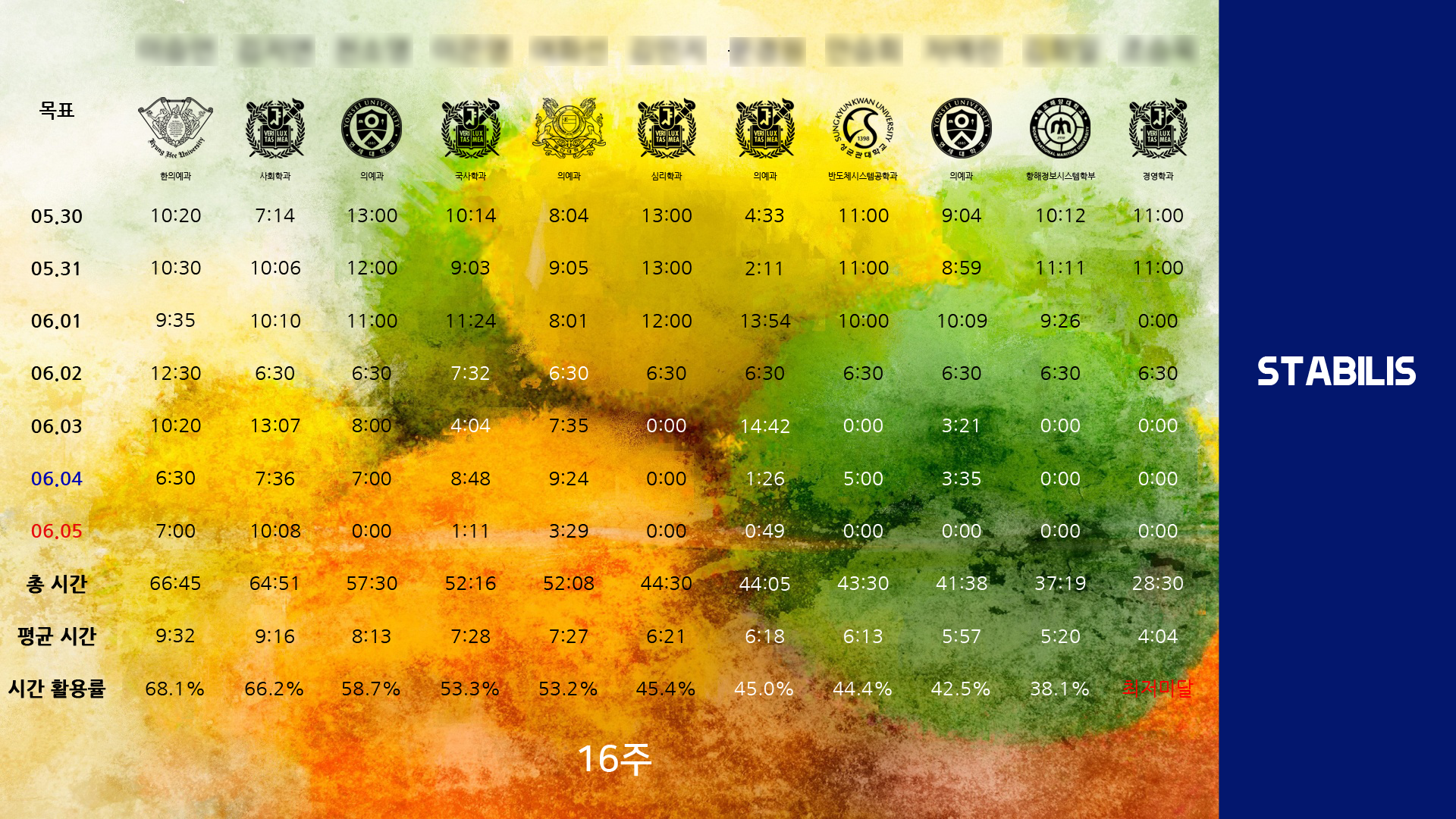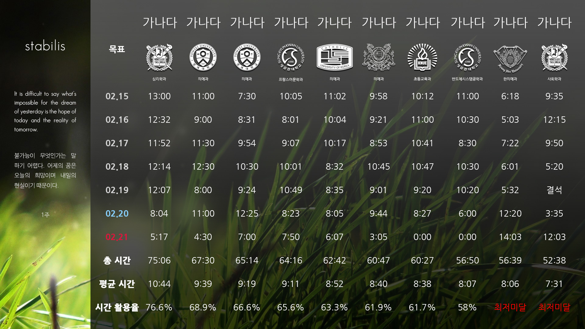 위의 표는 스타빌리스 1주차 공부시간 표이다. 신상 문제로 이름은 가나다로 바꾸었는데 나머지는 진짜다!