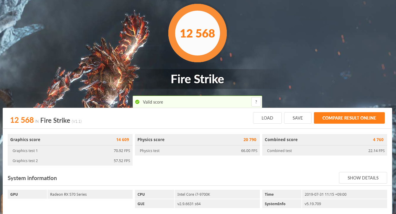 RX 570은 코어 1345 Mhz + 메모리 2000 Mhz + 타이밍 레벨 1로 두고 벤치마크를 돌렸다.