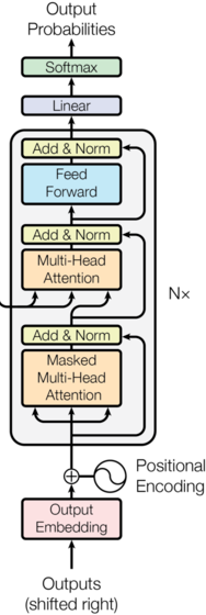 Outputs(출력)을 받고 Output Probabilities를 출력하는 오른쪽 부분이 Decoder(디코더)이다.